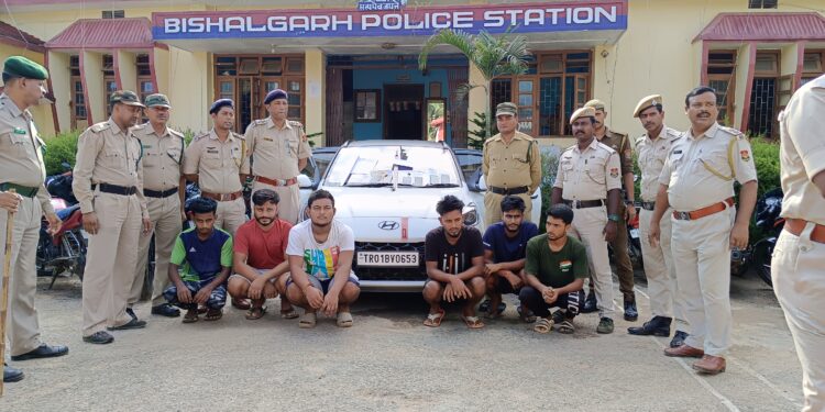 শনিবার রাতে ধলাই জেলার একজন এবং আগরতলা প্রতাপগড় সুভাষ নগরের দুই বন্ধু মোট তিন বন্ধু মিলে উদয়পুর মাতাবাড়ি গিয়েছিল একজনের বন্ধুর বাবার শরীর অসুস্থ থাকায় পূজো দিতে।পূজো দিয়ে বাড়ি ফেরার পথে রাস্তারমাথা বন্ধন ব্যাংকের সামনে আসতেই তাদের বাইকের পেট্রোল শেষ হয়ে যায়।ফলে তারা বাধ্য হয়ে তিন বন্ধু মিলে বাইকটিকে ঠেলে আগরতলার উদ্দেশ্যে রওনা হয়।এমন সময় হঠাৎ করে দুটি গাড়ি তাদের পথ আগলে ধরে।দুটি গাড়ি থেকে আট নয় জনের একটি দুষ্কৃতী দল ধারালো অস্ত্রশস্ত্র নিয়ে তাদের কাছ থেকে দামি মোবাইল সেট নগদ টাকা পয়সা সব লুটে নিয়ে চম্পট দেয়।ফলে তারা নিরুপায় হয়ে সামনের দিকে এগিয়ে যেতেই বিশালগড় থানা পুলিশের নাকা চেকিং পার্টির সামনে পড়ে।তাদের কাছে সমস্ত ঘটনা খুলে বলতেই শুরু হয় পুলিশের তৎপরতা এবং ঘন্টা খানেকের মধ্যেই কমলাসাগর বিধানসভার মিয়া পারার বাপন মিয়াকে(২৩) তার TR01BV0653 নম্বরের হোন্ডাই i10 গাড়িসহ গাড়ির ভেতরে থাকা অন্তর মিয়া(১৮),জুয়েল মিয়া(২০),সুমন মিয়া(১৯) এবং নতুন কলোনির সাগর নম:(১৯) ও সুশান্ত দেব(২৪)কে ধারালো অশ্রসস্ত্র সহ আটক করতে সক্ষম হয়।রবিবার বিশালগড় থানার পুলিশ তাদের বিরুদ্ধে IPC U/S 395/382-E/323/506 ধারা মোতাবেক একটি মামলা নথিভুক্ত করে যার নম্বর BLG P.S Case No-93/2023।রবিবার বিকেলে বিশালগড় থানার ওসি তাপস দাস জানান তদন্তের স্বার্থে ছিনতাই কান্ডে ব্যবহার করা অপর গাড়িটির নম্বর এবং যারা যুক্ত রয়েছে তাদের নাম সামনে আনা সম্ভব হচ্ছে না তবে খুব শীঘ্রই তাদেরকেও জালে তোলা হবে বলে আশ্বস্ত করেন